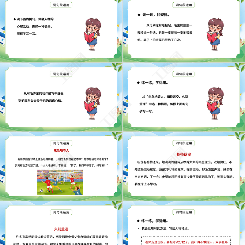 從“焦急地等人、期待落空、久別重逢”中選一種情景,仿照上面的句子寫一寫。詞句段運用練一練,學(xué)運用。