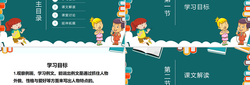 學(xué)習(xí)目標(biāo)1.觀察例畫,學(xué)習(xí)例文。能說出例文是通過抓住人物外貌、性格與愛好等方面來寫出人物特點(diǎn)的。 2.仿例,能為同學(xué)、老師、家長或想像中的人物畫像,并學(xué)習(xí)運(yùn)用例文的寫法來寫一篇習(xí)作。