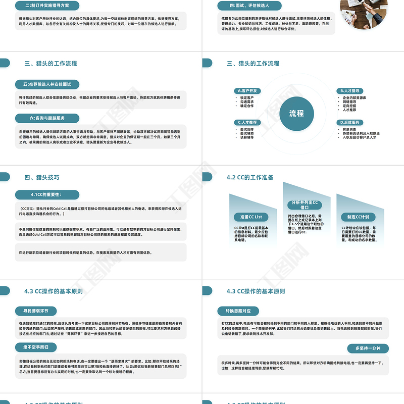三、獵頭的工作流程一:分析、評估客戶需求對客戶的企業(yè)文化、歷史、產(chǎn)品、管理風(fēng)格有透徹的了解;與客戶進行充分、有效的溝通,并與客戶共同對空缺崗位進行分析,總結(jié)該崗位的職責(zé)、任職資格及相應(yīng)的薪酬水準(zhǔn)。二:制訂并實施獵尋方案根據(jù)獵頭對客戶所處行業(yè)的認(rèn)識,結(jié)合崗位的具體要求,為每一空缺崗位制定詳細的搜尋方案。依據(jù)搜尋方案,利用人才數(shù)據(jù)庫、與各行業(yè)有關(guān)機構(gòu)及人士的網(wǎng)絡(luò)關(guān)系,憑借專門的技巧,對每一位潛在的候選人進行接觸。