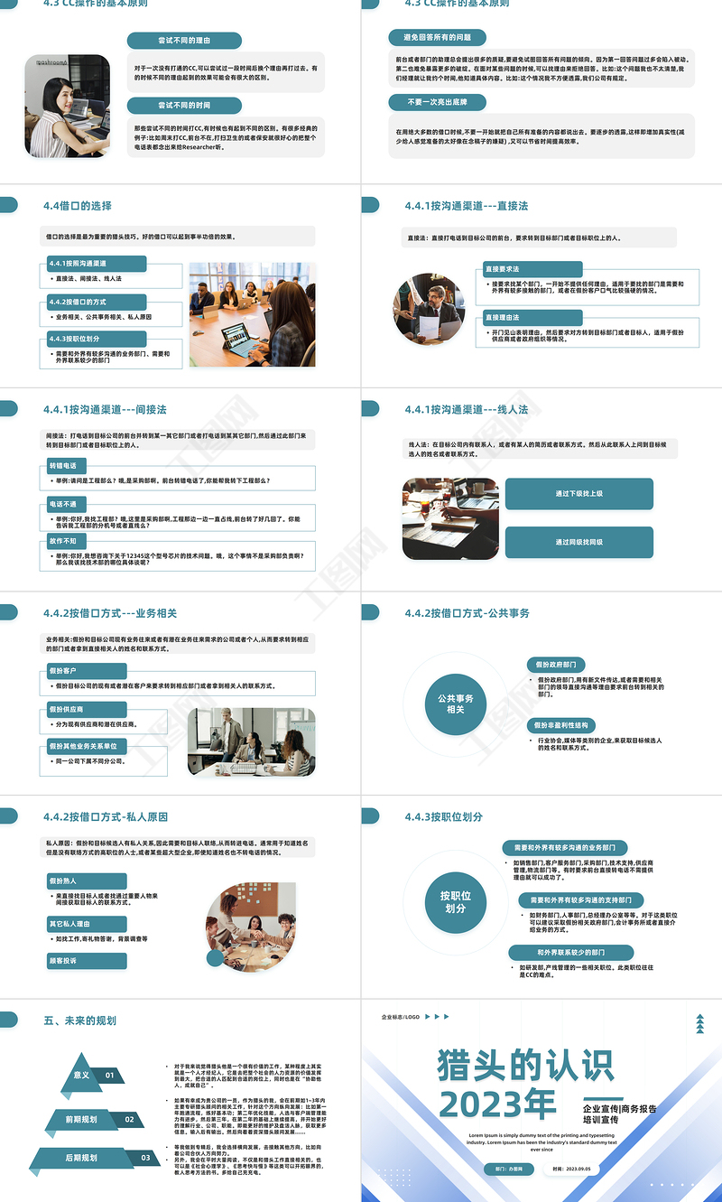 4.3 CC操作的基本原則避免回答所有的問題前臺或者部門的助理總會提出很多的質(zhì)疑,要避免試圖回答所有問題的傾向。因為第一回答問題過多會陷入被動。第二也難免暴露更多的破綻。在面對某些問題的時候,可以找理由來拒絕回答。比如:這個問題我也不太清楚,我們經(jīng)理就讓我約個時間,他知道具體內(nèi)容。比如:這個情況我不方便透露,我們公司有規(guī)定。不要一次亮出底牌在用絕大多數(shù)的借口時候,不要一開始就把自己所有準(zhǔn)備的內(nèi)容都說出去。要逐步的透露,這樣即增加真實性(減少給人感覺準(zhǔn)備的太好像在念稿子的嫌疑) ,又可以節(jié)省時間提高效率。