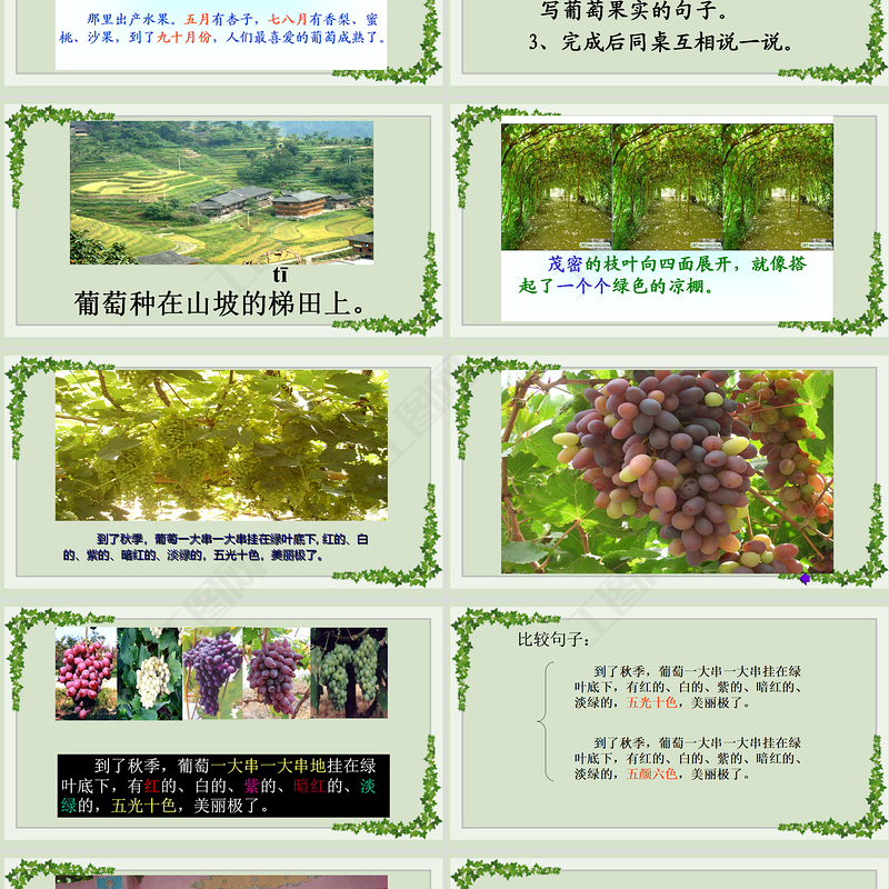 到了秋季,葡萄一大串一大串掛在綠葉底下, 紅的、白的、紫的、暗紅的、淡綠的,五光十色,美麗極了。