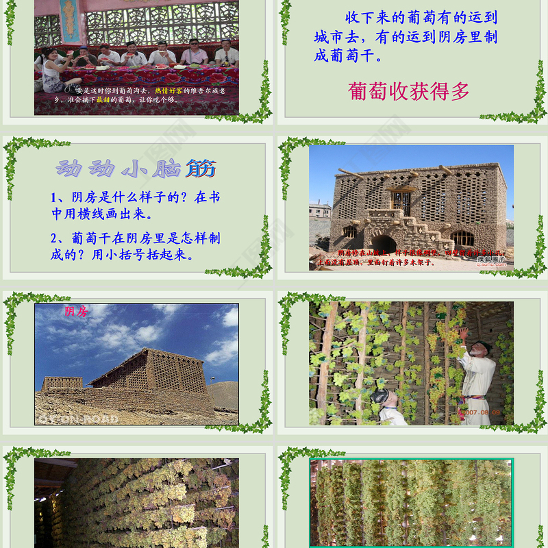 收下來的葡萄有的運(yùn)到城市去,有的運(yùn)到陰房里制成葡萄干。葡萄收獲得多