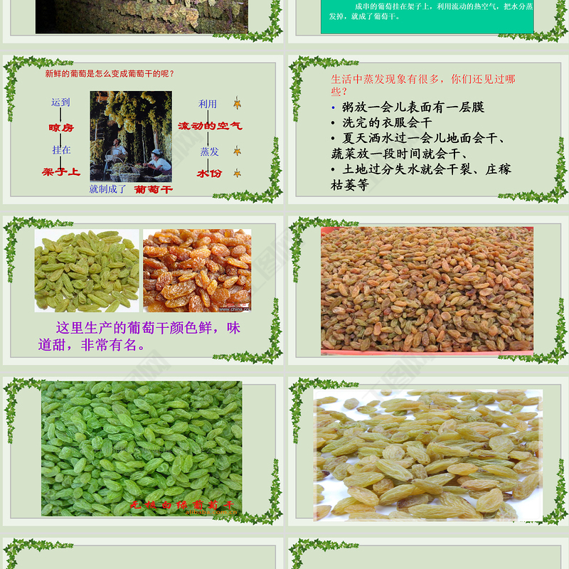 成串的葡萄掛在架子上,利用流動(dòng)的熱空氣,把水分蒸發(fā)掉,就成了葡萄干。