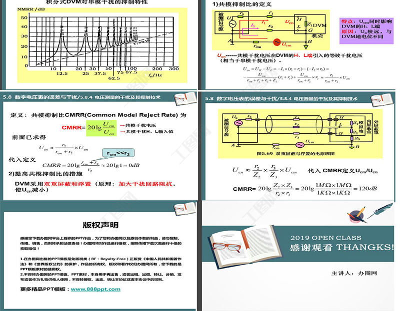 定義:共模抑制比CMRR(Common Model Reject Rate) 為 前面已求得代入定義2)提高共模抑制比的措施DVM采用雙重屏蔽和浮置(原理:加大干擾回路阻抗,使Ucn減小) →共模干擾電壓→共模干擾H、L輸入值rcm< 代入 CMRR定義Ucm/Ucn5.8 數字電壓表的誤差與干擾/5.8.4 電壓測量的干擾及其抑制技術 版權聲明感謝您下載辦圖網平臺上提供的PPT作品,為了您和辦圖網以及原創(chuàng)作者的利益,請勿復制、傳播、銷售,否則將承擔法律責任!辦圖網將對作品進行維權,按照傳播下載次數進行十倍的索取賠償!1.在辦圖網出售的PPT模板是免版稅類(RF:Royalty-Free)正版受《中國人民共和國著作法》和《世界版權公約》的保護,作品的所有權、版權和著作權歸辦圖網所有,您下載的是PPT模板素材的使用權。2.不得將辦圖網的PPT模板、PPT素材,本身用于再出售,或者出租、出借、轉讓、分銷、發(fā)布或者作為禮物供他人使用,不得轉授權、出賣、轉讓本協(xié)議或者本協(xié)議中的權利。更多精品PPT模板:www.888ppt.com 感謝觀看 THANGKS! 2019 OPEN CLASS主講人:辦圖網