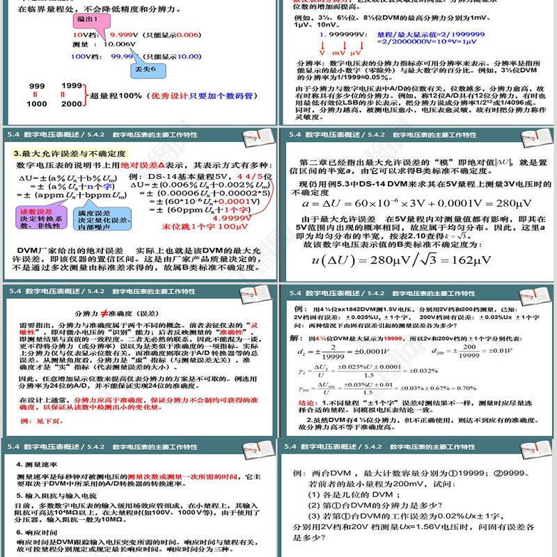 例:用4 ?位sx1842DVM測1.5V電壓,分別用2V檔和200檔測量,已知:2V檔固有誤差:±0.025%Ux ±1個字,200V檔固有誤差:±0.03%Ux ±1個字問:兩種情況下由固有誤差引起的測量誤差各為多少?解:因4 ?位DVM最大顯示為19999,所以2v和200v檔的±1個字分別代表:結論:1.不同量程“±1個字”誤差對測結果不一樣,測量時應盡量選擇合適的量程。同模擬電壓表結論一致。 2.雖然DVM有4 ?位分辨力,但不正確使用,則達不到應有的準確度。故分辨力高不等于準確度高。5.4 數字電壓表概述 / 5.4.2 數字電壓表的主要工作特性