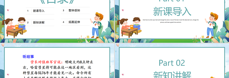 Part 01新課導(dǎo)入Click here to enter your text and change the color or size of the text. Insert the data text icon, change the picture, and have a good time.contents