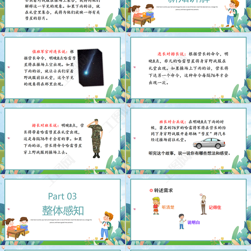 連長對排長說:根據(jù)營長的命令,明晚8點,非凡的哈雷彗星將身穿野戰(zhàn)服在禮堂出現(xiàn)。如果操場上下雨的話,營長將下達(dá)另一個命令,這種命令每隔76年才會出現(xiàn)一次。