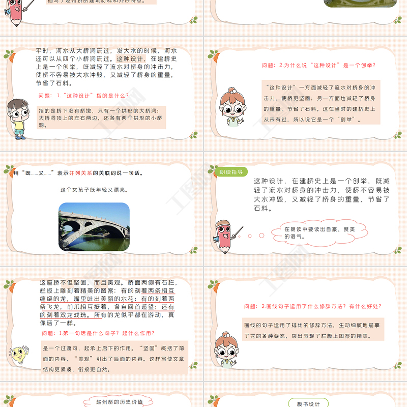問題:2.為什么說“這種設計”是一個創(chuàng)舉?“這種設計”一方面減輕了流水對橋身的沖擊力,使橋更堅固;另一方面也減輕了橋身的重量,節(jié)省了石料。這在當時的建橋史上從未有過,所以說它是一個“創(chuàng)舉”。