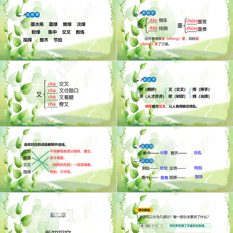 ①好像綠色的墨水瓶倒翻了, 到處是綠的……②到哪兒去找這么多的綠: 墨綠、淺綠、嫩綠、 翠綠、淡綠、粉綠…… 綠得發(fā)黑、綠得出奇;綠