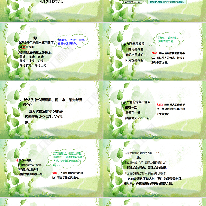 2.詩(shī)中景物最大的特點(diǎn)是什么?綠。3.文章中的“綠”實(shí)際上指的是什么?指生命的顏色,是生命的象征。4.這首詩(shī)表達(dá)了詩(shī)人怎樣的思想感情? 這首詩(shī)表達(dá)了詩(shī)人對(duì)“綠”的贊美及對(duì)生機(jī)勃勃、充滿希望的春天的喜愛(ài)之情。