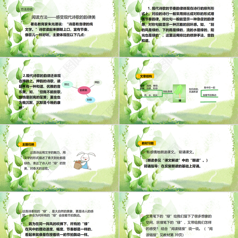 這首詩(shī)運(yùn)用文字的魅力,用文學(xué)的形式描述了春天到處都是綠色,表達(dá)了詩(shī)人對(duì)“綠”的贊美,對(duì)春天的謳歌。