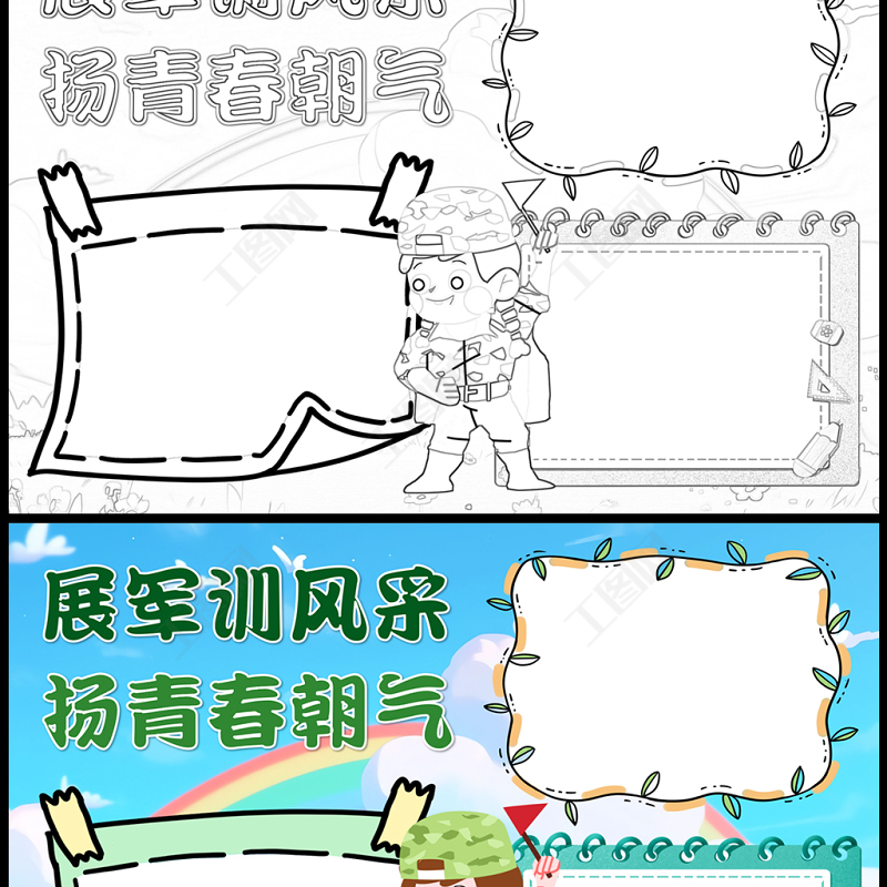 工圖網(wǎng)提供2023展軍訓(xùn)風(fēng)采揚(yáng)青春朝氣手抄報(bào)清新卡通新生軍訓(xùn)word電子小報(bào)模板供會員免費(fèi)下載。更多精彩黨課PPT素材,盡在工圖網(wǎng)。