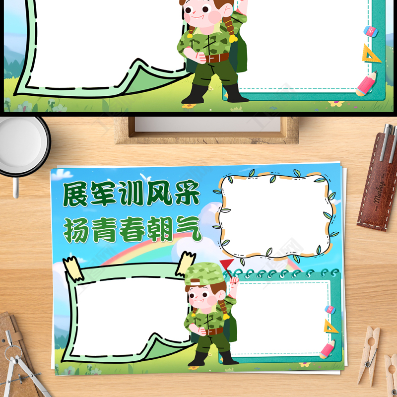 2023展軍訓(xùn)風(fēng)采揚(yáng)青春朝氣手抄報(bào)清新卡通新生軍訓(xùn)word電子小報(bào)模板