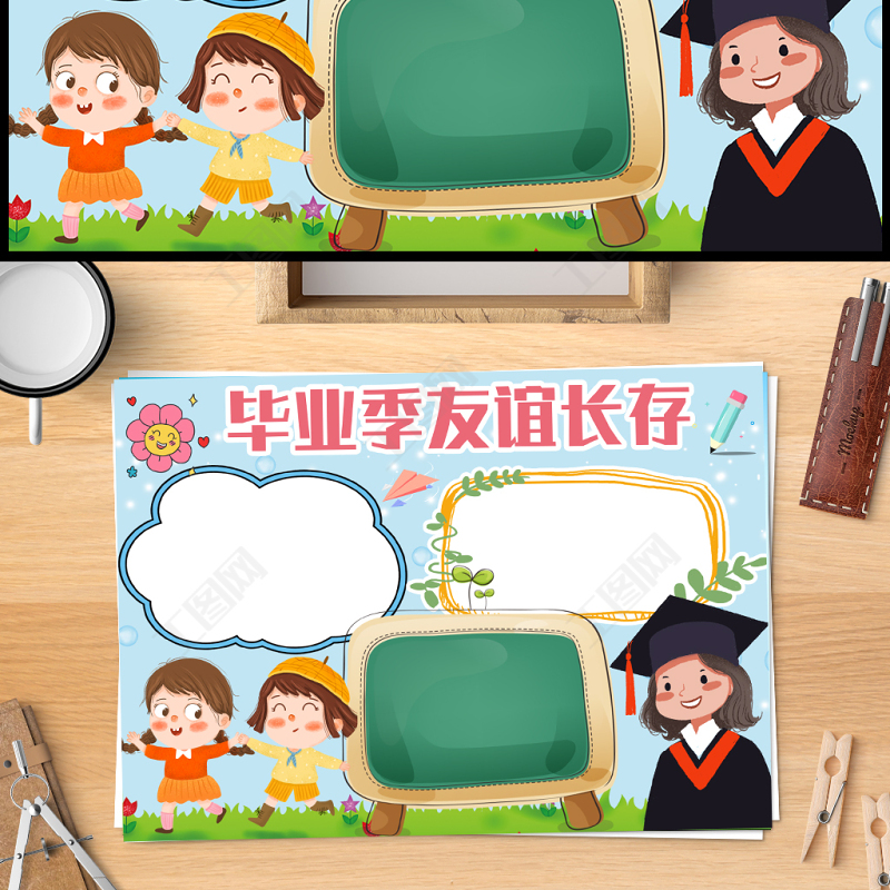 小學(xué)畢業(yè)手抄報藍色簡潔卡通風(fēng)畢業(yè)季友誼長存電子小報模板