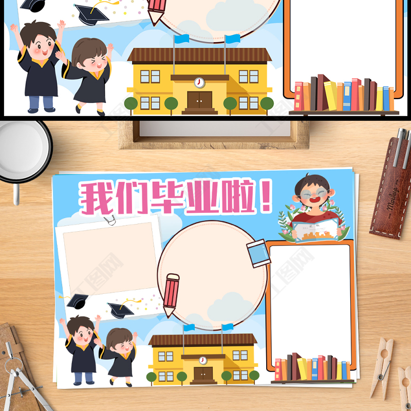 小學(xué)畢業(yè)手抄報(bào)清新卡通風(fēng)我們畢業(yè)啦再見母校電子小報(bào)模板 Array