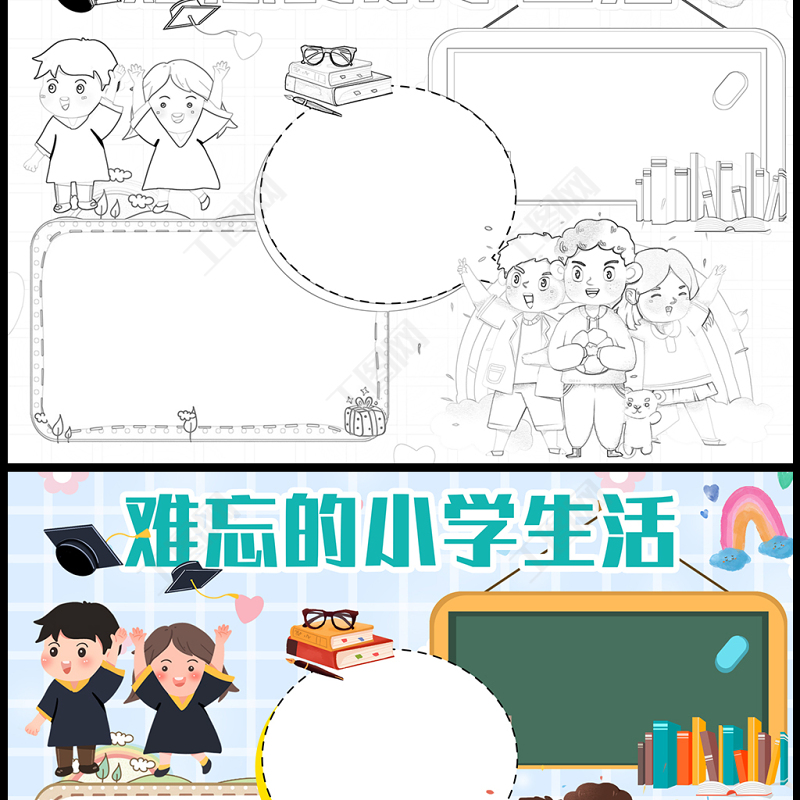小學畢業(yè)手抄報精美卡通難忘的小學生活再見母校電子小報模板 Array
