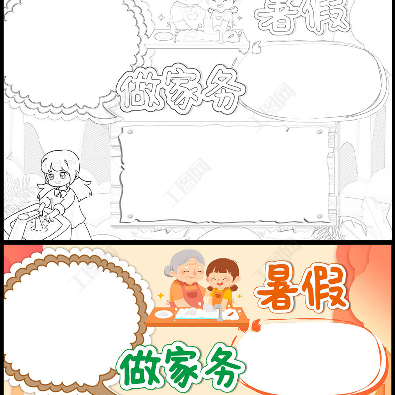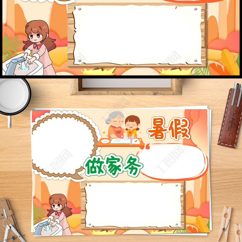2022暑假做家務(wù)手抄報(bào)卡通風(fēng)中小學(xué)生暑假勞動(dòng)電子小報(bào)模板 Array
