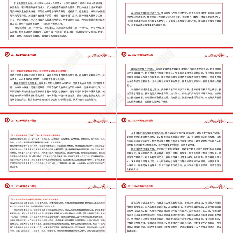 延遲符二、2024年經(jīng)濟社會發(fā)展總體要求和政策取向今年是中華人民共和國成立75周年,是實現(xiàn)“十四五”規(guī)劃目標任務的關鍵一年。做好政府工作,要在以習近平同志為核心的黨中央堅強領導下,以習近平新時代中國特色社會主義思想為指導,全面貫徹落實黨的二十大和二十屆二中全會精神,按照中央經(jīng)濟工作會議部署,堅持穩(wěn)中求進工作總基調(diào),完整、準確、全面貫徹新發(fā)展理念,加快構建新發(fā)展格局,著力推動高質量發(fā)展,全面深化改革開放,推動高水平科技自立自強,加大宏觀調(diào)控力度,統(tǒng)籌擴大內(nèi)需和深化供給側結構性改革,統(tǒng)籌新型城鎮(zhèn)化和鄉(xiāng)村全面振興,統(tǒng)籌高質量發(fā)展和高水平安全,切實增強經(jīng)濟活力、防范化解風險、改善社會預期,鞏固和增強經(jīng)濟回升向好態(tài)勢,持續(xù)推動經(jīng)濟實現(xiàn)質的有效提升和量的合理增長,增進民生福祉,保持社會穩(wěn)定,以中國式現(xiàn)代化全面推進強國建設、民族復興偉業(yè)。