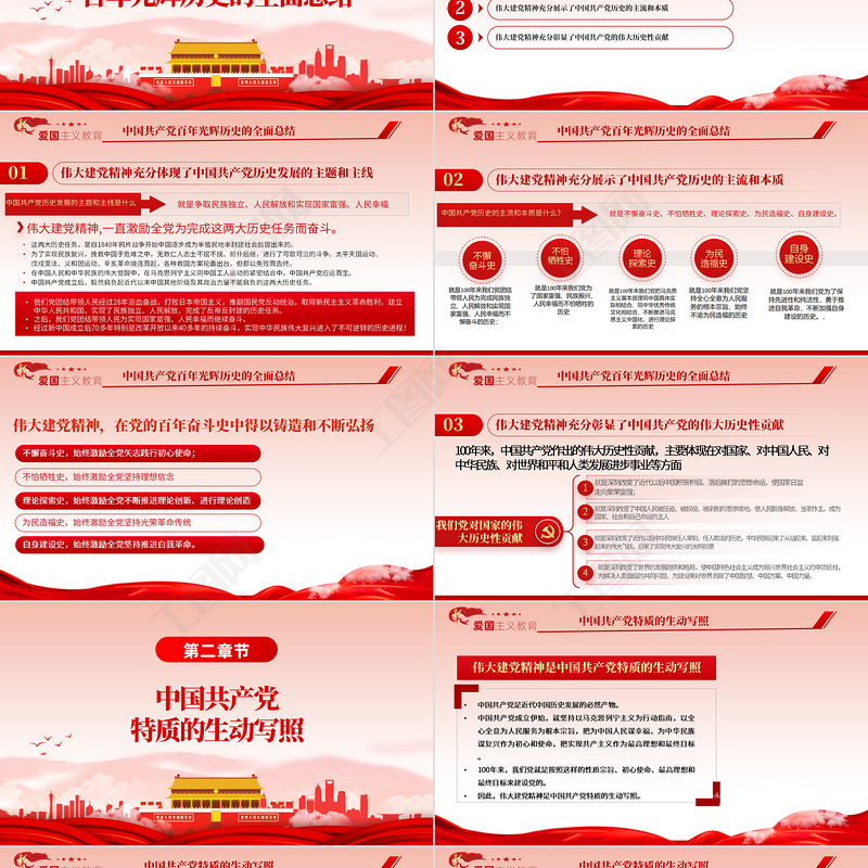 <p>(慶祝中國共產(chǎn)黨成立100周年專論)黨政部門/國有企業(yè)/黨支部2021年黨史學(xué)習(xí)教育專題弘揚偉大建黨精神</p><br><p> 前 言 / PREFACE 中國共產(chǎn)黨成立已經(jīng)整整100年了。100年對于不同政黨具有不同的意義。對于偉大的中國共產(chǎn)黨來講,百年只是宏偉事業(yè)的開始,只是威武雄壯活劇的序幕。中國共產(chǎn)黨立志于中華民族千秋偉業(yè),百年恰是風(fēng)華正茂。那么,中國共產(chǎn)黨永葆青春活力的秘訣是什么?在慶祝中國共產(chǎn)黨成立100周年大會上的重要講話中,總結(jié)、概括、提煉了我們黨在百年奮斗歷程中形成的偉大建黨精神,這就是“堅持真理、堅守理想,踐行初心、擔(dān)當(dāng)使命,不怕犧牲、英勇斗爭,對黨忠誠、不負(fù)人民”。偉大建黨精神,思想精辟、內(nèi)涵豐富,意義重大、意境深遠(yuǎn),深刻揭示了中國共產(chǎn)黨的特質(zhì),是我們?nèi)嬲J(rèn)識和準(zhǔn)確把握中國共產(chǎn)黨為什么能的一把金鑰匙。深入學(xué)習(xí)貫徹重要講話精神,對于我們弘揚偉大建黨精神、推進(jìn)黨的建設(shè)新的偉大工程、把新時代中國特色社會主義偉大事業(yè)推向前進(jìn),具有重大現(xiàn)實意義和深遠(yuǎn)歷史意義。</p><br><p>目錄01中國共產(chǎn)黨百年光輝歷史的全面總結(jié)02中國共產(chǎn)黨特質(zhì)的生動寫照03中國共產(chǎn)黨人精神譜系的高度凝練04新時代中國共產(chǎn)黨人繼續(xù)砥礪前行的強(qiáng)大動力</p><br><p>中國共產(chǎn)黨百年光輝歷史的全面總結(jié)</p><br><p>中國共產(chǎn)黨百年光輝歷史的全面總結(jié)偉大建黨精神充分體現(xiàn)了中國共產(chǎn)黨歷史發(fā)展的主題和主線偉大建黨精神充分展示了中國共產(chǎn)黨歷史的主流和本質(zhì)偉大建黨精神充分彰顯了中國共產(chǎn)黨的偉大歷史性貢獻(xiàn)中國共產(chǎn)黨百年光輝歷史的全面總結(jié)</p><br><p>中國共產(chǎn)黨百年光輝歷史的全面總結(jié)偉大建黨精神充分體現(xiàn)了中國共產(chǎn)黨歷史發(fā)展的主題和主線01中國共產(chǎn)黨歷史發(fā)展的主題和主線是什么就是爭取民族獨立、人民解放和實現(xiàn)國家富強(qiáng)、人民幸福這兩大歷史任務(wù),是自1840年鴉片戰(zhàn)爭開始中國逐步成為半殖民地半封建社會后提出來的。為了實現(xiàn)民族復(fù)興,挽救中國于危難之中,無數(shù)仁人志士不屈不撓、前仆后繼,進(jìn)行了可歌可泣的斗爭。太平天國運動、戊戌變法、義和團(tuán)運動、辛亥革命接連而起,各種救國方案輪番出臺,但都以失敗而告終。在中國人民和中華民族的偉大覺醒中,在馬克思列寧主義同中國工人運動的緊密結(jié)合中,中國共產(chǎn)黨應(yīng)運而生。中國共產(chǎn)黨成立后,毅然肩負(fù)起近代以來中國其他階級及其政治力量不能肩負(fù)的這兩大歷史任務(wù)。偉大建黨精神,一直激勵全黨為完成這兩大歷史任務(wù)而奮斗。我們黨團(tuán)結(jié)帶領(lǐng)人民經(jīng)過28年浴血奮戰(zhàn),打敗日本帝國主義,推翻國民黨反動統(tǒng)治,取得新民主主義革命勝利,建立中華人民共和國,實現(xiàn)了民族獨立、人民解放,完成了反帝反封建的歷史任務(wù)。之后,我們黨團(tuán)結(jié)帶領(lǐng)人民為實現(xiàn)國家富強(qiáng)、人民幸福而繼續(xù)奮斗。經(jīng)過新中國成立后70多年特別是改革開放以來40多年的持續(xù)奮斗,實現(xiàn)中華民族偉大復(fù)興進(jìn)入了不可逆轉(zhuǎn)的歷史進(jìn)程!</p><br><p>偉大建黨精神充分展示了中國共產(chǎn)黨歷史的主流和本質(zhì)02中國共產(chǎn)黨歷史的主流和本質(zhì)是什么?就是不懈奮斗史、不怕犧牲史、理論探索史、為民造福史、自身建設(shè)史。就是100年來我們黨團(tuán)結(jié)帶領(lǐng)人民為完成民族獨立、人民解放和實現(xiàn)國家富強(qiáng)、人民幸福而不懈奮斗的歷史;就是100年來我們黨為了國家富強(qiáng)、民族振興、人民幸福而不怕犧牲的歷史就是100年來我們黨把馬克思主義基本原理同中國具體實際相結(jié)合、同中華優(yōu)秀傳統(tǒng)文化相結(jié)合,不斷推進(jìn)馬克思主義中國化,進(jìn)行理論探索的歷史理論探索史不怕犧牲史不懈奮斗史就是100年來我們黨堅持全心全意為人民服務(wù)的根本宗旨,始終不渝為民造福的歷史就是100年來我們黨為了保持先進(jìn)性和純潔性,勇于推進(jìn)自我革命,不斷加強(qiáng)自身建設(shè)的歷史。,自身建設(shè)史為民造福史中國共產(chǎn)黨百年光輝歷史的全面總結(jié)</p><br><p>偉大建黨精神,在黨的百年奮斗史中得以鑄造和不斷弘揚不懈奮斗史,始終激勵全黨矢志踐行初心使命;不怕犧牲史,始終激勵全黨堅持理想信念理論探索史,始終激勵全黨不斷推進(jìn)理論創(chuàng)新、進(jìn)行理論創(chuàng)造為民造福史,始終激勵全黨堅持光榮革命傳統(tǒng)自身建設(shè)史,始終激勵全黨堅持推進(jìn)自我革命。中國共產(chǎn)黨百年光輝歷史的全面總結(jié)</p><br><p>偉大建黨精神充分彰顯了中國共產(chǎn)黨的偉大歷史性貢獻(xiàn)03100年來,中國共產(chǎn)黨作出的偉大歷史性貢獻(xiàn),主要體現(xiàn)在對國家、對中國人民、對中華民族、對世界和平和人類發(fā)展進(jìn)步事業(yè)等方面我們黨對國家的偉大歷史性貢獻(xiàn)就是深刻改變了近代以后中國積貧積弱、落