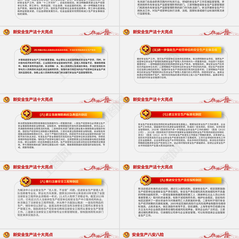 十大亮點(diǎn)建立事故預(yù)防和應(yīng)急救援的制度建立安全生產(chǎn)標(biāo)準(zhǔn)化制度推行注冊(cè)安全工程師制度推進(jìn)安全生產(chǎn)責(zé)任保險(xiǎn)制度加大對(duì)安全生產(chǎn)違法行為的責(zé)任追究力度