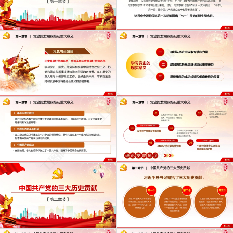 <p></p><br><p>目錄CONTENTS中國共產(chǎn)黨建黨一百周年黨史教育專題黨課不忘初心牢記使命爭做合格黨員黨史的發(fā)展脈絡(luò)及重大意義中國共產(chǎn)黨的三大歷史貢獻(xiàn)黨的歷史給我們的三大啟示一二三四</p><br><p>目錄CONTENTS中國共產(chǎn)黨建黨一百周年黨史教育專題黨課黨史的發(fā)展脈絡(luò)及重大意義中國共產(chǎn)黨的三大歷史貢獻(xiàn)黨的歷史給我們的三大啟示不忘初心牢記使命爭做合格黨員</p><br><p>黨史的發(fā)展脈絡(luò)及重大意義【 第一章節(jié) 】</p><br><p>第5頁中國共產(chǎn)黨于1921年7月23日成立后,在反動軍閥政府的殘暴統(tǒng)治之下,只能處于秘密狀態(tài),沒有公開進(jìn)行活動的環(huán)境。在大革命時期,黨忙于國共合作、開展工農(nóng)運(yùn)動和支援北伐戰(zhàn)爭,沒有條件對黨的誕生進(jìn)行紀(jì)念。把7月1日作為中國共產(chǎn)黨的誕辰紀(jì)念日,是毛zd同志于1938年5月提出來的。當(dāng)時,毛zd在《論持久戰(zhàn)》一文中提出:“今年七月一日,是中國共產(chǎn)黨建立的十七周年紀(jì)念日”。這是中央領(lǐng)導(dǎo)同志第一次明確提出“七一”是黨的誕生紀(jì)念日。中國共產(chǎn)黨建黨日第一章節(jié) | 黨史的發(fā)展脈絡(luò)及重大意義</p><br><p>第6頁歷史是最好的教科書,中國革命歷史是最好的營養(yǎng)劑。學(xué)習(xí)黨史、國史,是堅(jiān)持和發(fā)展中國特色社會主義、把黨和國家各項(xiàng)事業(yè)繼續(xù)推向前進(jìn)的必修課。在對歷史的深入思考中做好現(xiàn)實(shí)工作,更好走向未來,不斷交出堅(jiān)持和發(fā)展中國特色社會主義的合格答卷。第一章節(jié) | 黨史的發(fā)展脈絡(luò)及重大意義</p><br><p>第7頁學(xué)習(xí)黨史的現(xiàn)實(shí)意義可以從歷史中汲取智慧和力量是加強(qiáng)黨的思想理論建的重要任務(wù)是繼承黨的成功經(jīng)驗(yàn)和優(yōu)良傳統(tǒng)的需要一二三第一章節(jié) | 黨史的發(fā)展脈絡(luò)及重大意義</p><br><p>第8頁南方談話標(biāo)志著中國特色社會主義理論體系基本成形。(即**理論,三個代表重要思想和科學(xué)發(fā)展觀等)1 **理論成形 遵義會議確立以毛zd在中共中央的領(lǐng)導(dǎo)地位,是中共歷史上一個生死攸關(guān)的轉(zhuǎn)折點(diǎn),標(biāo)志著中國共產(chǎn)黨從幼稚走向成熟。2 毛zd思想基本形成 在陳獨(dú)秀、李大釗領(lǐng)導(dǎo)下創(chuàng)立了中國共產(chǎn)黨,翻開了中國革命的新篇章。3 中國共產(chǎn)黨成立第一章節(jié) | 黨史的發(fā)展脈絡(luò)及重大意義</p><br><p>第一章節(jié) | 黨史的發(fā)展脈絡(luò)及重大意義第9頁馬克思主義傳入中國,在陳獨(dú)秀、李大釗領(lǐng)導(dǎo)下創(chuàng)立了中國共產(chǎn)黨。馬克思主義的時代化,在**領(lǐng)導(dǎo)下創(chuàng)立了中國特色社會主義理論體系。沒有共產(chǎn)黨就沒有新中國只有共產(chǎn)黨才能發(fā)展中國中國特色社會主義道路是中國必由之路馬克思主義中的中國化,在毛zd領(lǐng)導(dǎo)下創(chuàng)立了毛zd思想。010203040506</p><br><p>中國共產(chǎn)黨的三大歷史貢獻(xiàn)【 第二章節(jié) 】</p><br><p>第11頁概括了三大歷史貢獻(xiàn):第一個第二個第三個實(shí)現(xiàn)了中國從幾千年封建專制政治向人民民主的偉大飛躍,這是一個偉大飛躍,是制度的飛躍實(shí)現(xiàn)了中華民族由不斷衰落到根本扭轉(zhuǎn)命運(yùn),持續(xù)走向繁榮富強(qiáng)的偉大飛躍,這是一個民族的飛躍,我們黨對民族的貢獻(xiàn);實(shí)現(xiàn)了中國人民從站起來到富起來、強(qiáng)起來的偉大飛躍,這是人民生活的根本改變,這是黨對人民的貢獻(xiàn)。第二章節(jié) | 中國共產(chǎn)黨的三大歷史貢獻(xiàn)</p><br><p>第12頁中國共產(chǎn)黨作為一個政治組織,對于中華民族、對于世界歷史、對于人類文明都做了什么?新政權(quán)建立了中華人民共和國建立了一套新的政權(quán)新制度建立了社會主義制度新道路改革開放開辟了中國特色社會主義的新道路第二章節(jié) | 中國共產(chǎn)黨的三大歷史貢獻(xiàn)</p><br><p>第13頁建立新政權(quán)015000多年中國文化沒有斷過建立中華民國北洋軍閥統(tǒng)治國民合作中國共產(chǎn)黨第二章節(jié) | 中國共產(chǎn)黨的三大歷史貢獻(xiàn)</p><br><p>第14頁第二章節(jié) | 中國共產(chǎn)黨的三大歷史貢獻(xiàn)開拓新制度02除了新政權(quán)以外,中國共產(chǎn)黨還建立起了社會主義制度?,F(xiàn)在我們享受的這個制度紅利都是新中國60多年間建立的,包括社會公平、社會治理、工業(yè)農(nóng)業(yè)的基礎(chǔ)體系,以及教育教材等,我們都是在這個環(huán)境里成長起來的。開拓新道路03第三個就是改革開放,建設(shè)中國特色社會主義道路。這不但是我們改革開放30多年走過的道路,也是我們將要走的道路。</p><br><p>黨的歷史給我們的三大啟示【 第三章節(jié) 】</p><br><p>第16頁歷史和人民選擇中國共產(chǎn)黨領(lǐng)導(dǎo)是正確的啟示一沒有中國共產(chǎn)黨的領(lǐng)導(dǎo)就沒有國家的統(tǒng)一。誰不想這個國家統(tǒng)一啊。國民黨不想統(tǒng)一嗎?袁世凱不想統(tǒng)一嗎?都想統(tǒng)一,但問題是他們做不到。第三章節(jié) | 黨的歷史給我們的三大啟示</p><br><p>第17頁中國共產(chǎn)黨領(lǐng)導(dǎo)的中國特色社會主義道路是正