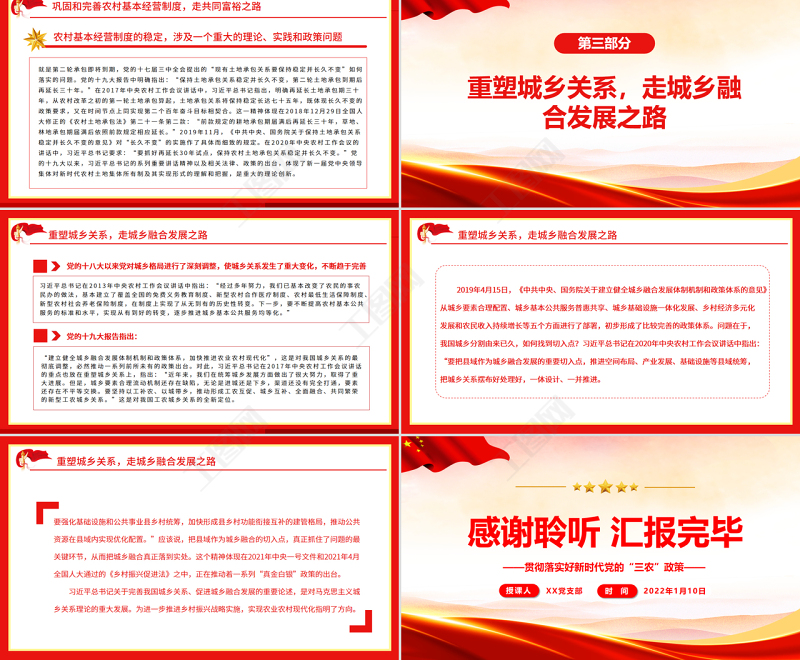 <p>貫徹落實(shí)好新時(shí)代黨的“三農(nóng)”政策——黨員干部學(xué)習(xí)教育專題黨課課件——</p><br><p>— 前 言 — 穩(wěn)住農(nóng)業(yè)基本盤,做好“三農(nóng)”工作意義重大。黨的十八大以來(lái),以習(xí)近平同志為核心的黨中央高度重視“三農(nóng)”工作,習(xí)近平總書記多次在中央農(nóng)村工作會(huì)議上發(fā)表重要講話。在糧食安全問題上,提出了“谷物基本自給,口糧絕對(duì)安全”新時(shí)期國(guó)家糧食安全戰(zhàn)略;在農(nóng)村基本經(jīng)營(yíng)制度上,提出了農(nóng)村土地所有權(quán)、承包權(quán)、經(jīng)營(yíng)權(quán)“三權(quán)分置”思想;在城鄉(xiāng)關(guān)系上,提出了“工農(nóng)互促、城鄉(xiāng)互補(bǔ)、全面融合、共同繁榮”的新型工農(nóng)城鄉(xiāng)關(guān)系。這些重要講話為做好新時(shí)代“三農(nóng)”工作提供了根本遵循。</p><br><p>目錄糧食安全是戰(zhàn)略問題1鞏固和完善農(nóng)村基本經(jīng)營(yíng)制度,走共同富裕之路2重塑城鄉(xiāng)關(guān)系,走城鄉(xiāng)融合發(fā)展之路3</p><br><p>糧食安全是戰(zhàn)略問題第一部分</p><br><p>糧食安全是戰(zhàn)略問題 “我國(guó)糧食是不是過(guò)關(guān)了呢?”并給予回答:“總體看,我國(guó)糧食安全基礎(chǔ)仍不穩(wěn)固,糧食安全形勢(shì)依然嚴(yán)峻,任何時(shí)候都不能輕言糧食過(guò)關(guān)了?!痹诖嘶A(chǔ)上,作出了“保障國(guó)家糧食安全是一個(gè)永恒課題,任何時(shí)候這根弦都不能放松” 的論斷。如何確保國(guó)家糧食安全?習(xí)近平總書記指出:“要進(jìn)一步明確糧食安全的工作重點(diǎn),合理配置資源,集中力量首先把最基本最重要的保住,確保谷物基本自給,口糧絕對(duì)安全。”從而確立了黨的十八大以來(lái)我國(guó)糧食安全的基本方略?! ↑h的十九大提出了鄉(xiāng)村振興戰(zhàn)略,2017年12月召開的中央農(nóng)村工作會(huì)議則重點(diǎn)部署黨在近期和長(zhǎng)期的鄉(xiāng)村振興工作。習(xí)近平總書記在講話中強(qiáng)調(diào)了糧食安全在鄉(xiāng)村振興中的重要位置,指出:“在我們這樣一個(gè)十三億多人口的大國(guó),糧食多了是問題,少了也是問題,但這是兩種不同性質(zhì)的問題。多了是庫(kù)存壓力,是財(cái)政壓力;少了是社會(huì)壓力,是整個(gè)大局的壓力。”“現(xiàn)在講糧食安全,實(shí)際上是食物安全。老百姓的食物需求更加多樣化了,這就要求我們轉(zhuǎn)變觀念,樹立大農(nóng)業(yè)觀、大食物觀,向耕地草原森林海洋、向植物動(dòng)物微生物要熱量、要蛋白,全方位多途徑開發(fā)食物資源?!绷?xí)近平總書記在2013年中央農(nóng)村工作會(huì)議講話中提出世紀(jì)之問:</p><br><p>糧食安全是戰(zhàn)略問題 自2004年以來(lái),我國(guó)的農(nóng)產(chǎn)品國(guó)際貿(mào)易從長(zhǎng)期的貿(mào)易順差變成逆差,基本呈逐年增大趨勢(shì)。2020年,新冠肺炎疫情和變幻莫測(cè)的世界政治經(jīng)濟(jì)形勢(shì)相疊加,給我國(guó)的糧食供給鏈帶來(lái)了很多不穩(wěn)定因素。因此,習(xí)近平總書記在2020年中央農(nóng)村工作會(huì)議講話中特別強(qiáng)調(diào)了農(nóng)業(yè)尤其是糧食對(duì)全局穩(wěn)定的重要性。他講道:“這次是我主動(dòng)提出要來(lái)講講的,目的是向全黨全社會(huì)發(fā)出明確信號(hào):‘三農(nóng)’工作在新征程上仍然極端重要,須臾不可放松,務(wù)必抓緊抓實(shí)。”提出:“我們要堅(jiān)持用大歷史觀來(lái)看待農(nóng)業(yè)、農(nóng)村、農(nóng)民問題,只有深刻理解了‘三農(nóng)’問題,才能更好理解我們這個(gè)黨、這個(gè)國(guó)家、這個(gè)民族?!薄笆冀K立足自身抓好農(nóng)業(yè)生產(chǎn),以國(guó)內(nèi)穩(wěn)產(chǎn)保供的確定性來(lái)應(yīng)對(duì)外部環(huán)境的不確定性?!边@是未來(lái)相當(dāng)長(zhǎng)時(shí)期內(nèi)我國(guó)農(nóng)業(yè)工作的指導(dǎo)方針。新冠肺炎疫情發(fā)生以來(lái),全世界20多個(gè)國(guó)家先后宣布禁止稻谷、小麥等主要糧食品種出口,對(duì)我國(guó)糧食進(jìn)口造成了一定影響。</p><br><p>糧食安全是戰(zhàn)略問題 因此,習(xí)近平總書記強(qiáng)調(diào)指出:“糧食多一點(diǎn)少一點(diǎn)是戰(zhàn)術(shù)問題,糧食安全是戰(zhàn)略問題?!薄拔覈?guó)糧食供求緊平衡的格局沒有改變,結(jié)構(gòu)性矛盾剛著手解決,總量不足問題又重新凸顯。今后一個(gè)時(shí)期糧食需求還會(huì)持續(xù)增加,供求緊平衡將越來(lái)越緊,再加上國(guó)際形勢(shì)復(fù)雜嚴(yán)峻,確保糧食安全的弦要始終繃得很緊很緊,寧可多生產(chǎn)、多儲(chǔ)備一些,多了的壓力和少了的壓力不可同日而語(yǔ)。糧食生產(chǎn)年年要抓緊,面積、產(chǎn)量不能掉下來(lái),供給、市場(chǎng)不能出問題。”</p><br><p>鞏固和完善農(nóng)村基本經(jīng)營(yíng)制度,走共同富裕之路第二部分</p><br><p>鞏固和完善農(nóng)村基本經(jīng)營(yíng)制度,走共同富裕之路</p><br><p>第三,堅(jiān)持穩(wěn)定土地承包關(guān)系。家家包地、戶戶務(wù)農(nóng),是農(nóng)村基本經(jīng)營(yíng)制度的基本實(shí)現(xiàn)形式。 家庭承包、專業(yè)大戶經(jīng)營(yíng),家庭承包、家庭農(nóng)場(chǎng)經(jīng)營(yíng),家庭承包、集