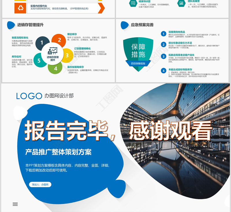 報告完畢,感謝觀看產(chǎn)品推廣整體策劃方案LOGO辦圖網(wǎng)設計部本PPT策劃方案模板含具體內容,內容完整、全面、詳細,下載后稍加改動后即可使用。
