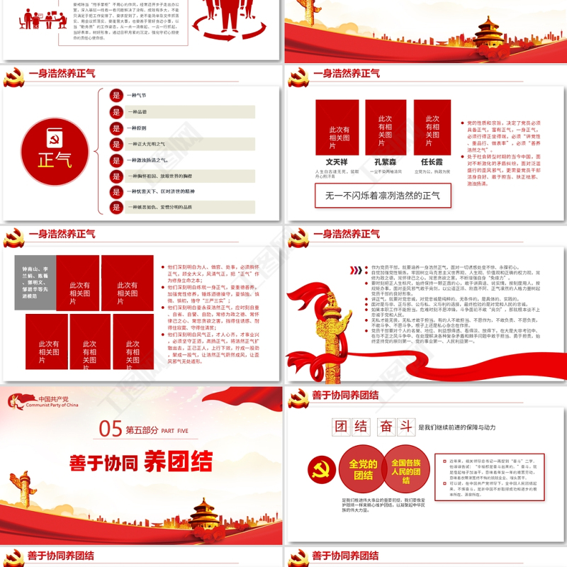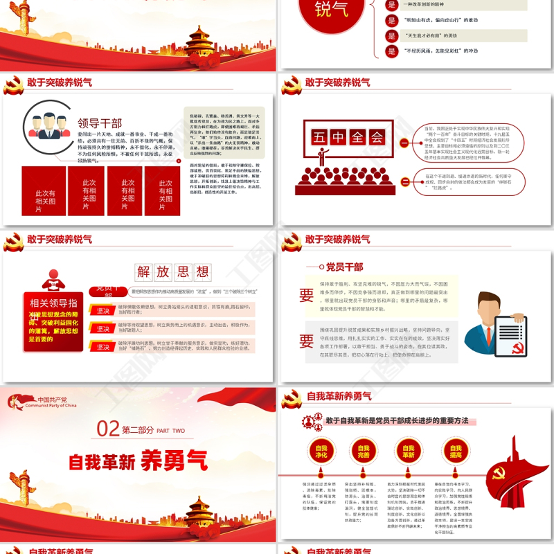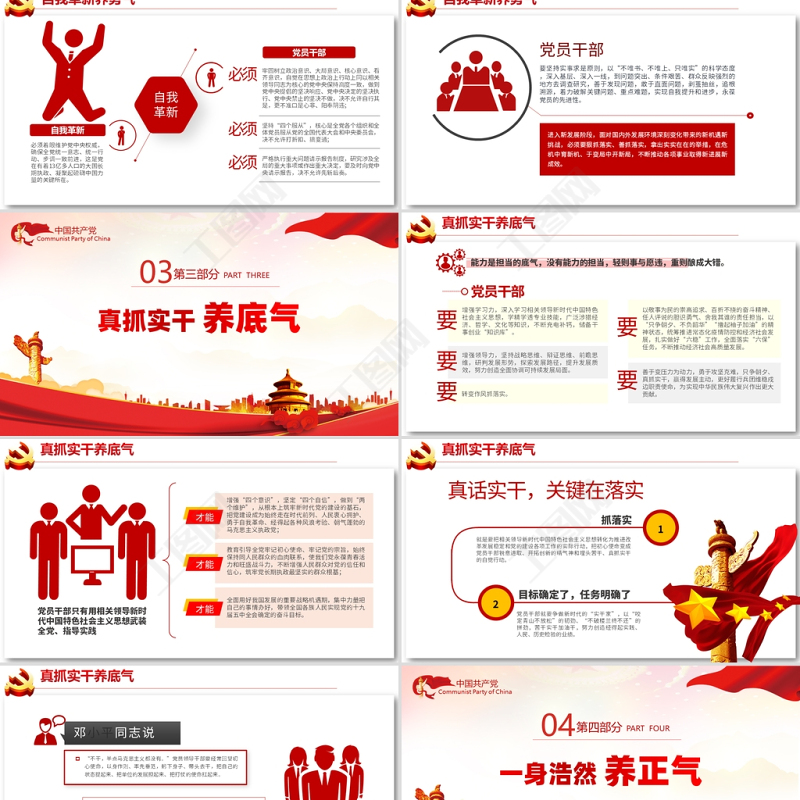 <p>中國(guó)共產(chǎn)黨Communist Party of China——2021最新黨課系列真抓實(shí)干</p><br><p>毛主席說(shuō):“黨的政治路線確定之后,干部就是決定因素?!秉h員干部作為各項(xiàng)事業(yè)建設(shè)的中流砥柱、執(zhí)行樞紐,肩負(fù)著創(chuàng)新發(fā)展的重任、肩負(fù)著人民群眾的期盼,必須牢記使命、擔(dān)當(dāng)作為,以好作風(fēng)激揚(yáng)正能量,推動(dòng)經(jīng)濟(jì)社會(huì)高質(zhì)量發(fā)展,在實(shí)現(xiàn)中華民族偉大復(fù)興的新征程中闊步前行。</p><br><p>敢于突破養(yǎng)銳氣一自我革新養(yǎng)勇氣二真抓實(shí)干養(yǎng)底氣三一身浩然養(yǎng)正氣四善于協(xié)同養(yǎng)團(tuán)結(jié)五</p><br><p>中國(guó)共產(chǎn)黨Communist Party of China敢于突破 養(yǎng)銳氣01第一部分 PART ONE</p><br><p>敢于突破養(yǎng)銳氣是有一股子勁兒,保持一種永遠(yuǎn)向上的進(jìn)取態(tài)勢(shì),展現(xiàn)的是一種高昂的工作熱情和工作韌性,具有勇往無(wú)前的魅力。一種膽量,是一種魄力是是一種攻堅(jiān)克難的品質(zhì)一種改革創(chuàng)新的精神是是“明知山有虎,偏向虎山行”的敢勁“天生我才必有用”的勇勁是是“不經(jīng)歷風(fēng)雨,怎能見(jiàn)彩虹”的沖勁</p><br><p>領(lǐng)導(dǎo)干部要闖出一片天地、成就一番事業(yè)、干成一番功績(jī),必須具有一往無(wú)前、百折不撓的氣概,保持頑強(qiáng)持久的拚搏精神,永不僵化,永不停滯,不為任何風(fēng)險(xiǎn)所懼,不被任何干擾所惑,永葆昂揚(yáng)銳氣。焦裕祿、孔繁森、楊善洲、黃文秀等一大批優(yōu)秀黨員,在為政為民之路上,面對(duì)多方阻力和攔路虎,即使困難再艱巨、矛盾再?gòu)?fù)雜,他們始終沒(méi)有放棄,而是鼓足勇氣,“敢”字當(dāng)頭,直面問(wèn)題,迎難而上,以“殺出一條血路”的大無(wú)畏精神,敢動(dòng)真格,敢碰硬茬,妥善解決關(guān)乎民生、群眾反映強(qiáng)烈的問(wèn)題;面對(duì)發(fā)展的僵局,敢于祛除守?cái)偙N?、按部就班、畏首畏尾、裹足不前的狹隘思想,敢于沖破舊的思想障礙和觀念束縛,解放思想,開(kāi)拓創(chuàng)新,找準(zhǔn)上級(jí)決策精神與工作實(shí)際和群眾愿望的最佳結(jié)合點(diǎn),出高招、出新招,創(chuàng)造性的開(kāi)展工作。敢于突破養(yǎng)銳氣</p><br><p>五中全會(huì)當(dāng)前,我國(guó)正處于實(shí)現(xiàn)中華民族偉大復(fù)興和實(shí)現(xiàn)“兩個(gè)一百年”奮斗目標(biāo)的關(guān)鍵時(shí)期,十九屆五中全會(huì)規(guī)劃了“十四五”時(shí)期經(jīng)濟(jì)社會(huì)發(fā)展指導(dǎo)思想、主要目標(biāo)和必須遵循的原則以及到二〇三五年基本實(shí)現(xiàn)社會(huì)主義現(xiàn)代化遠(yuǎn)景目標(biāo),新一輪經(jīng)濟(jì)社會(huì)高質(zhì)量大發(fā)展已經(jīng)拉開(kāi)帷幕。在這個(gè)不進(jìn)則退、慢進(jìn)亦退的新時(shí)代,任何墨守成規(guī)、固步自封的做法都會(huì)成為發(fā)展的“絆腳石”“攔路虎”。敢于突破養(yǎng)銳氣</p><br><p>沖破思想觀念的障礙、突破利益固化的藩籬,解放思想是首要的相關(guān)領(lǐng)導(dǎo)指出要把解放思想作為推動(dòng)高質(zhì)量發(fā)展的“法寶”,做到“三個(gè)破除三個(gè)樹(shù)立”黨員干部堅(jiān)決破除懶散依賴思想,樹(shù)立勇站潮頭的進(jìn)取意識(shí),抓鐵有痕,踏石留印,當(dāng)好踐行者;堅(jiān)決破除等待觀望思想,樹(shù)立乘勢(shì)而上的機(jī)遇意識(shí),主動(dòng)出擊,積極作為,當(dāng)好破題人;堅(jiān)決破除浮躁功利思想,樹(shù)立甘于奉獻(xiàn)的服務(wù)意識(shí),做實(shí)顯功,練好潛功,當(dāng)好“鋪路石”,努力創(chuàng)造經(jīng)得起歷史、實(shí)踐和人民群眾檢驗(yàn)的業(yè)績(jī)。敢于突破養(yǎng)銳氣</p><br><p>保持敢于勝利、攻堅(jiān)克難的銳氣,不因壓力大而氣餒,不因困難多而停步,不因競(jìng)爭(zhēng)強(qiáng)而退卻,真正做到哪里的問(wèn)題最突出,哪里就出現(xiàn)黨員干部的身影和聲音;哪里的矛盾最復(fù)雜,哪里就體現(xiàn)黨員干部的智慧和才能。要圍繞鞏固提升脫貧成果和實(shí)施鄉(xiāng)村振興戰(zhàn)略,堅(jiān)持問(wèn)題導(dǎo)向,堅(jiān)守底線思維,用扎扎實(shí)實(shí)的工作、實(shí)實(shí)在在的成效,堅(jiān)決落實(shí)好各項(xiàng)工作部署,以敢干擔(dān)當(dāng)、勇于戰(zhàn)斗的姿態(tài),在其位謀其政,在其職盡其責(zé),把初心落在行動(dòng)上、把使命擔(dān)在肩膀上。要敢于突破養(yǎng)銳氣</p><br><p>中國(guó)共產(chǎn)黨Communist Party of China自我革新 養(yǎng)勇氣02第二部分 PART TWO</p><br><p>自我革新養(yǎng)勇氣自我凈化強(qiáng)調(diào)通過(guò)過(guò)濾雜質(zhì)、清除毒素、割除毒瘤,不斷純潔黨的隊(duì)伍,保證黨的肌體健康;敢于自我革新是黨員干部成長(zhǎng)進(jìn)步的重要方法自我完善突出堅(jiān)持補(bǔ)短板、強(qiáng)弱項(xiàng)、固根本,防源頭、治苗頭、打露頭,堵塞制度漏洞,健全監(jiān)督機(jī)制,提升黨的長(zhǎng)期執(zhí)政能力;自我革新著力深刻把握時(shí)代發(fā)展大勢(shì),堅(jiān)決破除一切不合時(shí)宜的思想觀念和體制機(jī)制弊端,勇于推進(jìn)理論創(chuàng)新、實(shí)踐創(chuàng)新、制度創(chuàng)新、文化創(chuàng)新以及各方面創(chuàng)新,通過(guò)革故鼎新