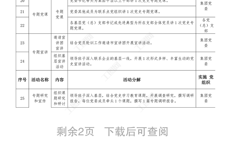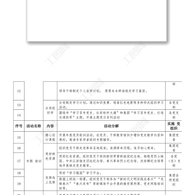 工圖網(wǎng)提供2021國企黨史學(xué)習(xí)教育活動(dòng)安排及任務(wù)分解表 (1)供會(huì)員免費(fèi)下載。更多精彩黨課PPT素材,盡在工圖網(wǎng)。