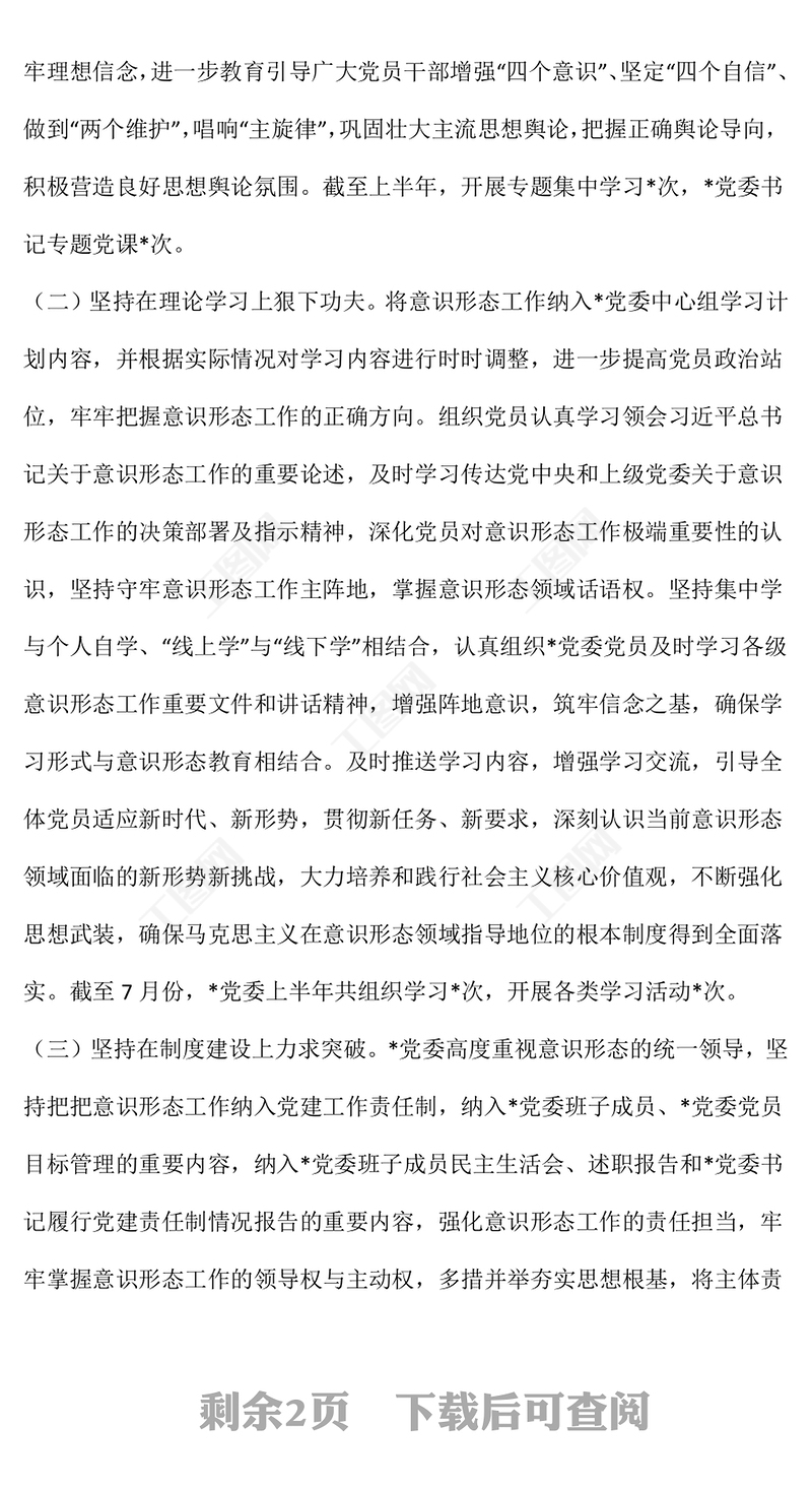 > 黨課講稿 > 2023年上半年意識形態(tài)工作責(zé)任制落實(shí)情況自查報(bào)告PPT模板(講稿).DOCX 【圖片、文字、動(dòng)畫均可編輯】