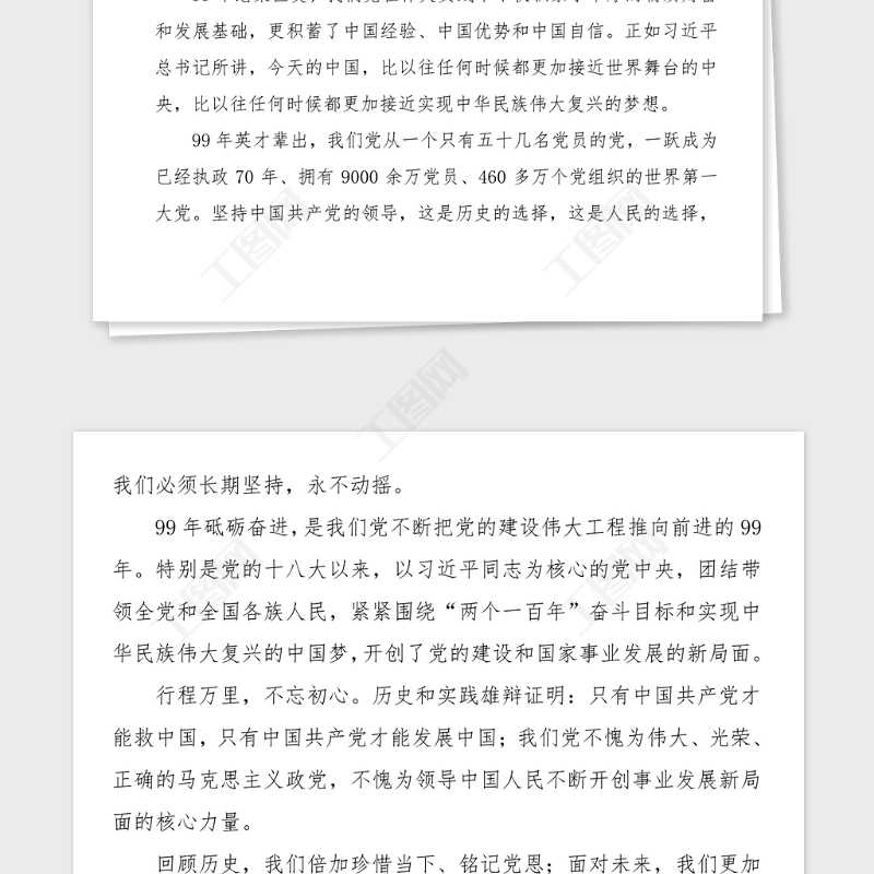 工圖網(wǎng)提供七一演講稿不斷堅(jiān)定理想信念在憶黨史感黨恩中繼承發(fā)揚(yáng)優(yōu)良傳統(tǒng)七一建黨節(jié)99周年心得體會(huì)研討發(fā)言材料演講稿征文參考供會(huì)員免費(fèi)下載。更多精彩黨課PPT素材,盡在工圖網(wǎng)。