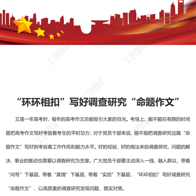 工圖網(wǎng)提供“環(huán)環(huán)相扣”寫好調(diào)查研究“命題作文”(學(xué)習(xí)心得)供會員免費(fèi)下載。更多精彩黨課PPT素材,盡在工圖網(wǎng)。