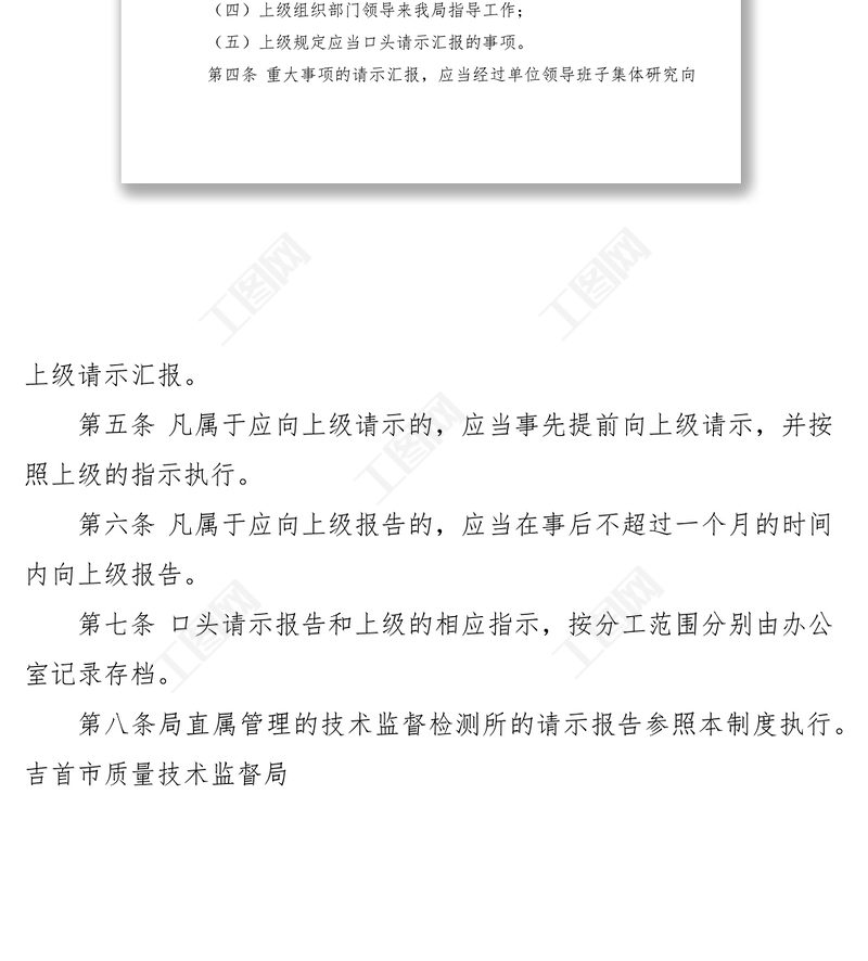工圖網(wǎng)提供2021質(zhì)監(jiān)局請(qǐng)示報(bào)告制度供會(huì)員免費(fèi)下載。更多精彩黨課PPT素材,盡在工圖網(wǎng)。