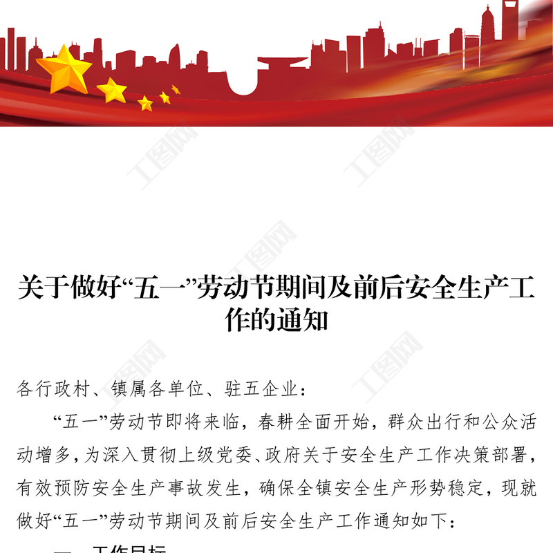 工圖網(wǎng)提供關(guān)于做好“五一”勞動節(jié)期間及前后安全生產(chǎn)工作的通知(20230412)供會員免費下載。更多精彩黨課PPT素材,盡在工圖網(wǎng)。
