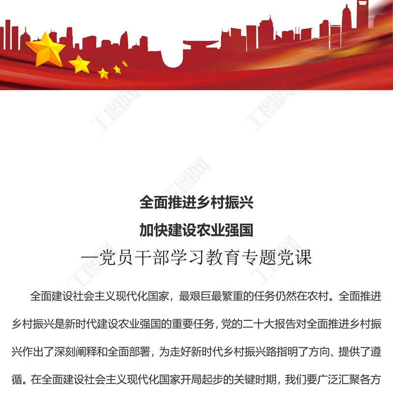 工圖網(wǎng)提供2023全面推進(jìn)鄉(xiāng)村振興加快建設(shè)農(nóng)業(yè)強(qiáng)國PPT大氣精美風(fēng)黨員干部學(xué)習(xí)教育專題黨課課件(講稿)供會員免費(fèi)下載。更多精彩黨課PPT素材,盡在工圖網(wǎng)。