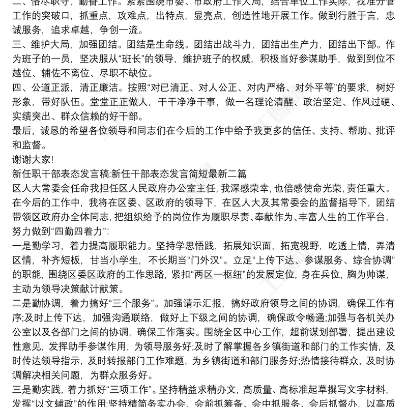 首頁 > WORD文檔 > 演講稿 > 新任職干部表態(tài)發(fā)言稿:新任干部表態(tài)發(fā)言簡短最新三篇.DOCX 【圖片、文字、動畫均可編輯】