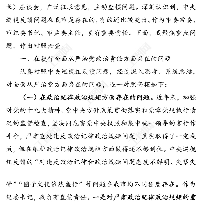 2022巡察整改專(zhuān)題民主生活會(huì)領(lǐng)導(dǎo)班子對(duì)照檢查材料2022年巡察整改專(zhuān)題民主生活會(huì)對(duì)照檢查材料剖析模板2022組織生活會(huì)民主生活會(huì)談心談話(huà)提綱2022巡察整改專(zhuān)題民主生活會(huì)個(gè)人材料2021一案一整改專(zhuān)題民主生活會(huì)對(duì)照檢查材料2022年度巡察整改專(zhuān)題民主生活會(huì)班子對(duì)照檢查材料2022專(zhuān)題民主生活會(huì)會(huì)前集中學(xué)習(xí)研討發(fā)言提綱2022巡察整改專(zhuān)題民主生活會(huì)要談心談話(huà)記錄2022巡察反饋問(wèn)題整改專(zhuān)題民主生活會(huì)個(gè)人對(duì)照檢查材料2022縣教育局局長(zhǎng)巡察整改專(zhuān)題民主生活會(huì)檢視剖析材料2022涉糧巡查反饋問(wèn)題整改專(zhuān)題民主生活會(huì)個(gè)人發(fā)言2022巡察整改專(zhuān)題民主生活會(huì)黨委書(shū)記對(duì)照檢查材料2022巡察整改專(zhuān)題民主生活會(huì)會(huì)前談心談話(huà)提綱2022巡察整改專(zhuān)題民主生活會(huì)黨組書(shū)記個(gè)人對(duì)照檢查材料