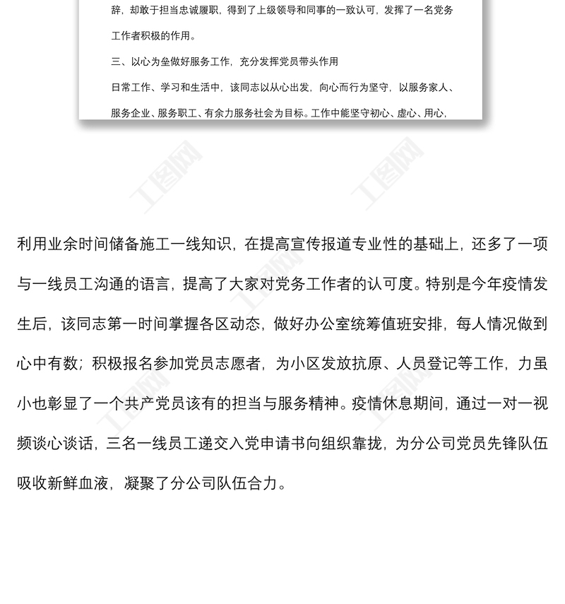 工圖網(wǎng)提供施工企業(yè)優(yōu)秀黨務(wù)工作者事跡供會(huì)員免費(fèi)下載。更多精彩黨課PPT素材,盡在工圖網(wǎng)。