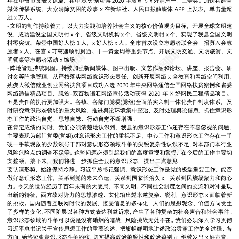 2021年意識形態(tài)工作學習材料2022關于意識形態(tài)工作的重要論述發(fā)言稿2021黨支部書記意識形態(tài)工作述職報告2022黨員領導干部網(wǎng)絡意識形態(tài)工作教育培訓工作方案鄉(xiāng)鎮(zhèn)意識形態(tài)研判專題會議記錄2021黨委黨組網(wǎng)絡意識形態(tài)工作責任實施細則全文2021意識形態(tài)工作組織生活會材料2021網(wǎng)絡意識形態(tài)工作分析研判報告2022黨支部年度意識形態(tài)工作報告公安意識形態(tài)工作計劃2021中學2021年意識形態(tài)工作總結2021車隊意識形態(tài)工作總結社區(qū)2021年上半年意識形態(tài)工作總結2022年第二季度意識形態(tài)工作報告