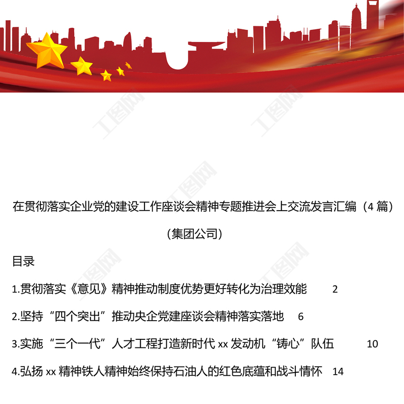 工圖網(wǎng)提供在貫徹落實(shí)企業(yè)黨的建設(shè)工作座談會(huì)精神專題推進(jìn)會(huì)上交流發(fā)言匯編(4篇)(集團(tuán)公司)供會(huì)員免費(fèi)下載。更多精彩黨課PPT素材,盡在工圖網(wǎng)。