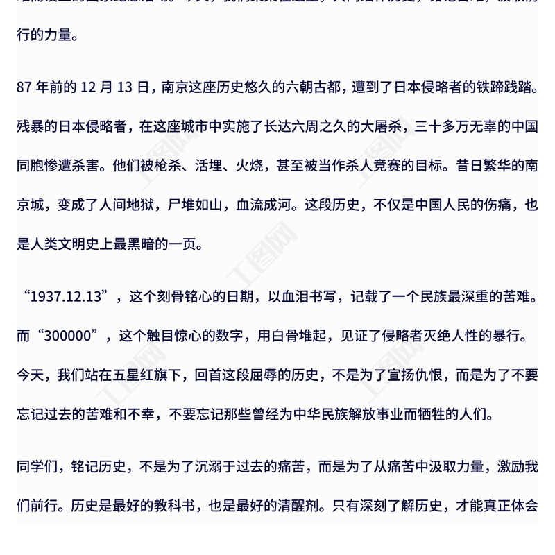 首頁(yè) > WORD文檔 > 黨課講稿 > 銘記苦難歷史汲取前行力量PPT12月13日國(guó)家公祭日宣講課件(講稿).DOCX 【圖片、文字、動(dòng)畫均可編輯】