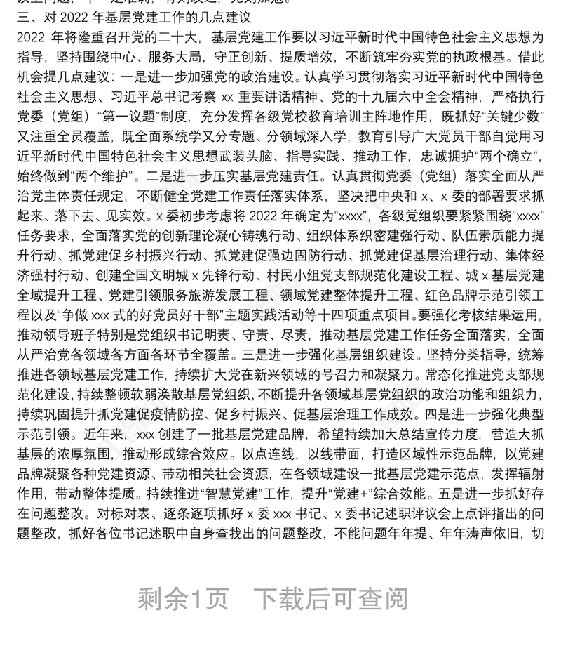 2022抓黨建工作述職報(bào)告2022融媒體中心黨建工作述職報(bào)告2022公司關(guān)于推進(jìn)基層黨建三基本建設(shè)與三基工作有機(jī)融合的實(shí)施方案村委會(huì)抓基層黨建工作述職報(bào)告2022年最新2022年機(jī)關(guān)黨支部黨建工作述職評(píng)議考核反饋問題整改方案保險(xiǎn)公司黨建工作述職報(bào)告20222022抓基層黨建和人才工作述職報(bào)告2022圖書館黨建工作述職報(bào)告2022黨組書記在黨風(fēng)廉政建設(shè)匯報(bào)會(huì)上的講話2022年人大黨建工作述職報(bào)告2022年小學(xué)黨建工作述職報(bào)告2022基層黨建工作述職報(bào)告述職評(píng)議會(huì)上點(diǎn)評(píng)2023抓基層黨建工作總結(jié)