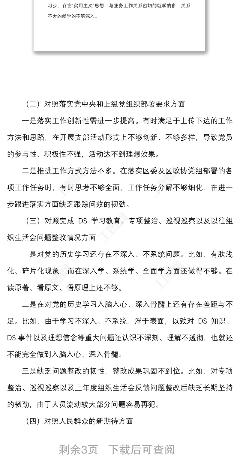 工圖網(wǎng)提供2021年度政協(xié)黨支部組織生活會班子對照檢查材料范文供會員免費下載。更多精彩黨課PPT素材,盡在工圖網(wǎng)。