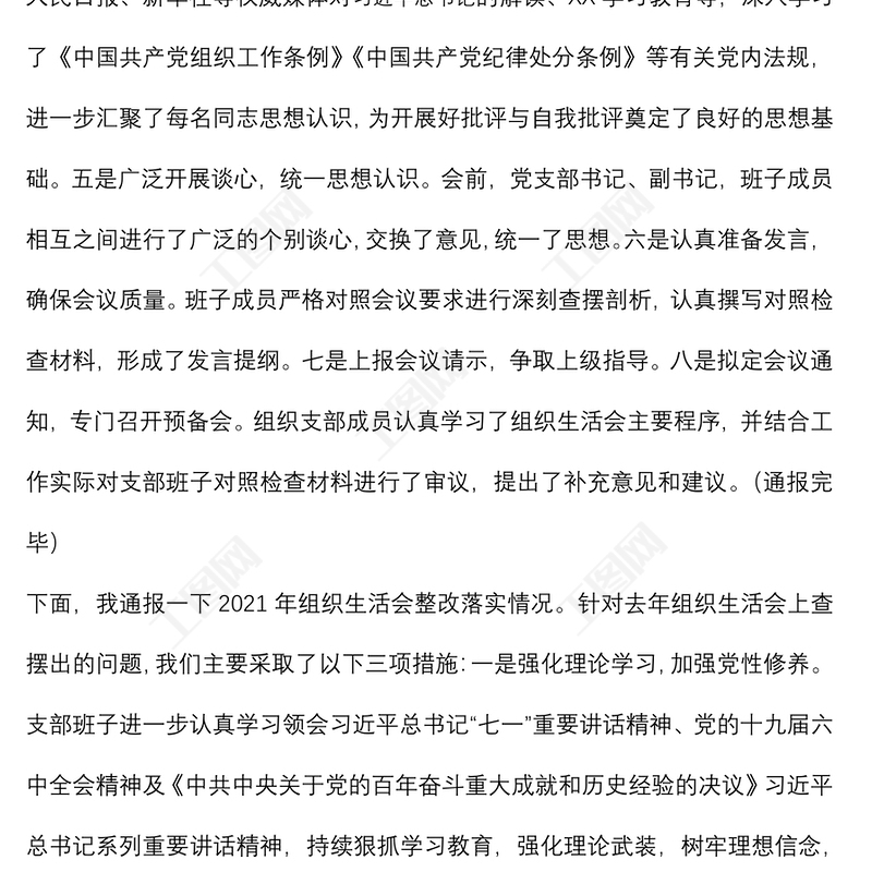 工圖網(wǎng)提供黨支部2021年專題組織生活會(huì)前準(zhǔn)備及整改落實(shí)情況供會(huì)員免費(fèi)下載。更多精彩黨課PPT素材,盡在工圖網(wǎng)。