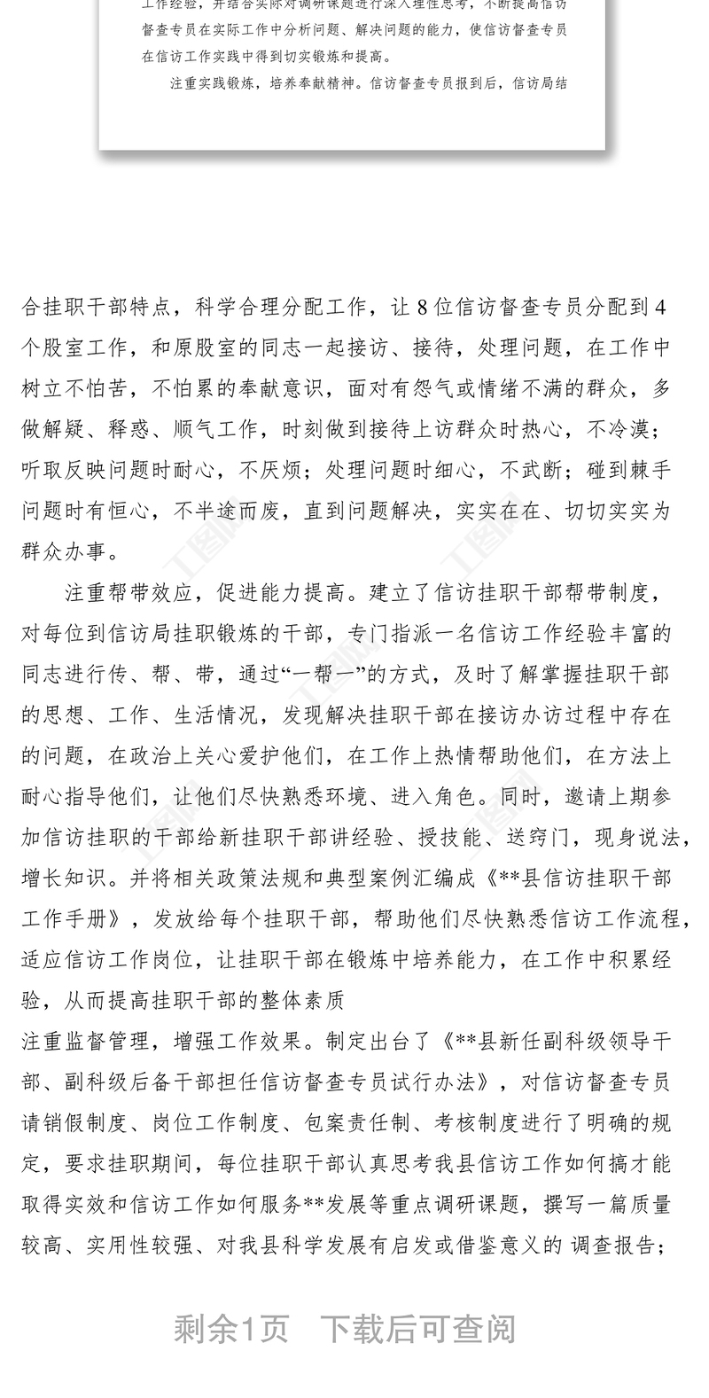 工圖網(wǎng)提供2021選派干部到信訪局掛職鍛煉經(jīng)驗(yàn)作法供會(huì)員免費(fèi)下載。更多精彩黨課PPT素材,盡在工圖網(wǎng)。