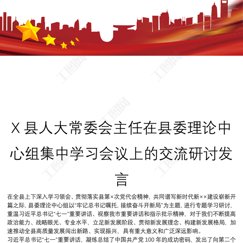 工圖網(wǎng)提供X縣人大常委會主任在縣委理論中心組集中學(xué)習(xí)會議上的交流研討發(fā)言供會員免費(fèi)下載。更多精彩黨課PPT素材,盡在工圖網(wǎng)。