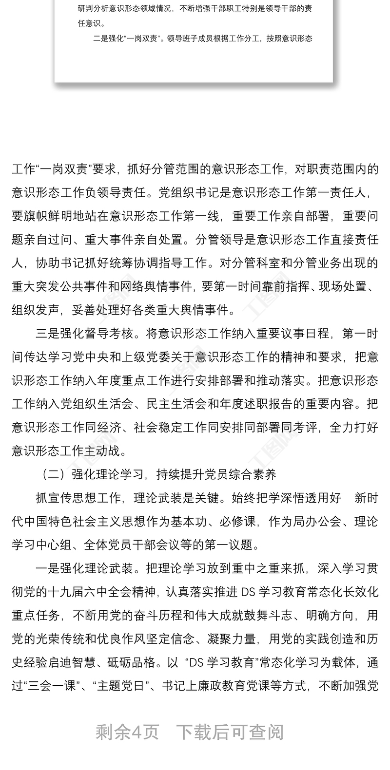 2021年意識(shí)形態(tài)工作學(xué)習(xí)材料2022意識(shí)形態(tài)工作研判報(bào)告意識(shí)形態(tài)工作調(diào)研報(bào)告2022年2022融媒體中心意識(shí)形態(tài)工作總結(jié)2022實(shí)驗(yàn)幼兒園意識(shí)形態(tài)工作責(zé)任清單2022黨支部年度意識(shí)形態(tài)工作報(bào)告2022意識(shí)形態(tài)工作巡察重點(diǎn)及注意事項(xiàng)中學(xué)2021年意識(shí)形態(tài)工作總結(jié)2022意識(shí)形態(tài)工作風(fēng)險(xiǎn)點(diǎn)排查方案2022意識(shí)形態(tài)工作措施不夠深入的原因2021年個(gè)人意識(shí)形態(tài)工作述職2022關(guān)于審議意識(shí)形態(tài)工作報(bào)告的請(qǐng)示2021車(chē)隊(duì)意識(shí)形態(tài)工作總結(jié)2022檢察人意識(shí)形態(tài)工作學(xué)習(xí)心得體會(huì)2022意識(shí)形態(tài)工作一會(huì)一報(bào)制度文件消防大隊(duì)2021年意識(shí)形態(tài)工作總結(jié)