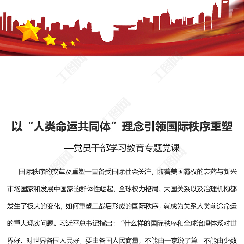 工圖網(wǎng)提供2023以“人類命運共同體”理念引領(lǐng)國際秩序重塑PPT大氣精美風(fēng)黨員干部學(xué)習(xí)教育專題黨課課件(講稿)供會員免費下載。更多精彩黨課PPT素材,盡在工圖網(wǎng)。