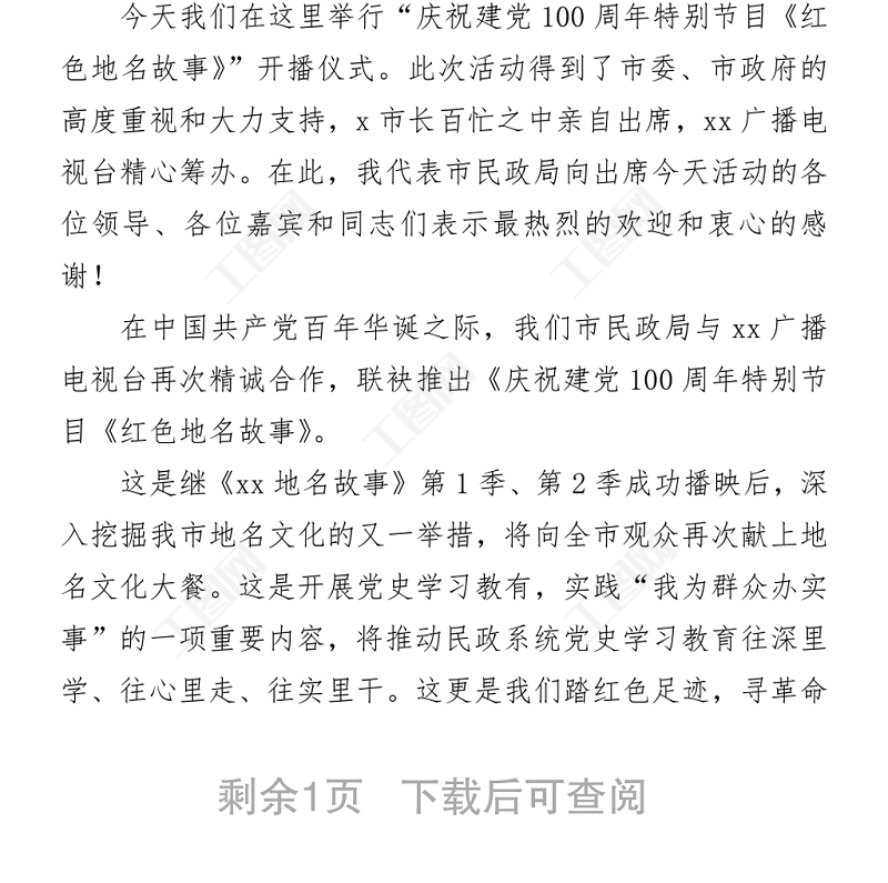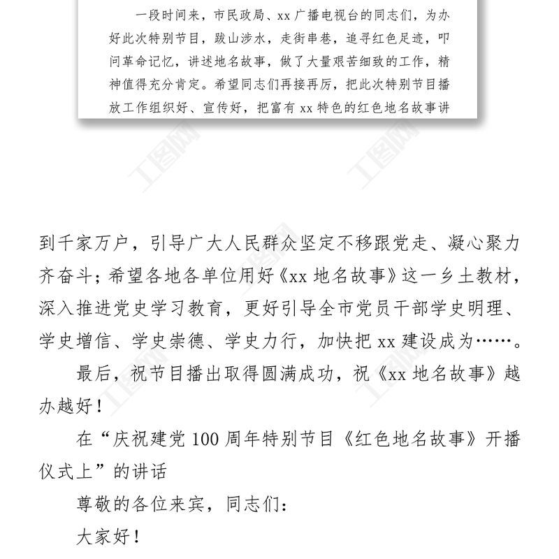 工圖網(wǎng)提供2021慶祝建黨100周年特別節(jié)目《紅色地名故事》開播儀式上的致辭和講話供會員免費(fèi)下載。更多精彩黨課PPT素材,盡在工圖網(wǎng)。