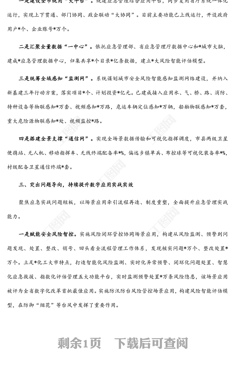 工圖網(wǎng)提供打造硬核支撐 賦能應(yīng)急實(shí)戰(zhàn) 以信息化數(shù)字化推進(jìn)應(yīng)急管理現(xiàn)代化——市應(yīng)急管理局交流發(fā)言材料供會(huì)員免費(fèi)下載。更多精彩黨課PPT素材,盡在工圖網(wǎng)。